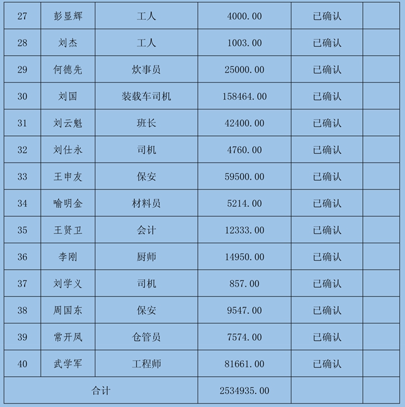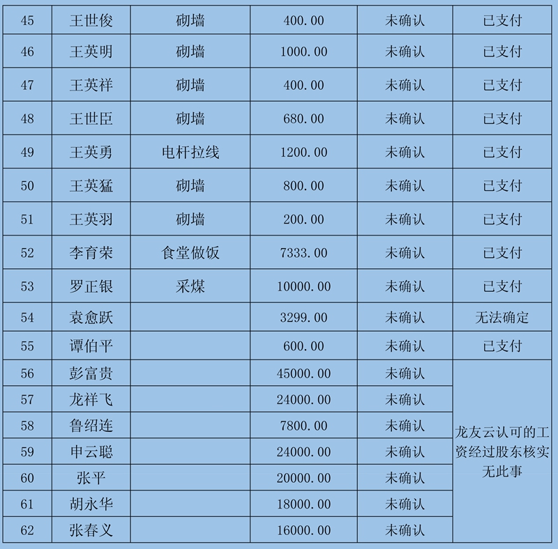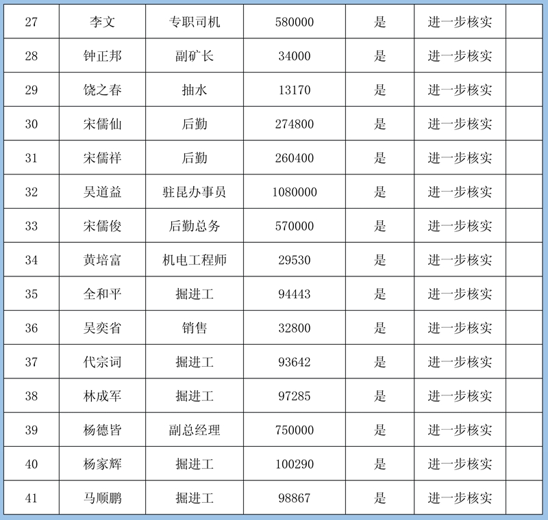 4、復(fù)核組意見:①煤礦管理方新提交的5份5人627萬元欠薪資料因證據(jù)不足暫緩確認(rèn);②羅克雄1415434元雖然提供的證據(jù)充足,但由于他是公司的總經(jīng)理且金額較大,需要再次確認(rèn);③其他40條欠薪證據(jù)屬實(shí),涉及40人2534935元可以確認(rèn)。