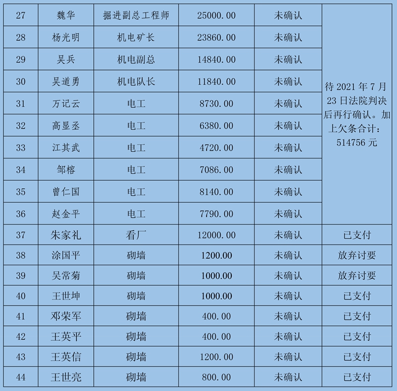 3、其他情況:登記確認(rèn)過程中魏華、楊光明兩個工隊(duì)提供欠薪相關(guān)證據(jù),但由于兩個工隊(duì)的上級主管歐秀坤已向法院提起訴訟,于2021年7月23日開庭,煤礦表示不知道歐秀坤的訴訟里面是否含兩個工隊(duì)的欠薪,待查明情況后再做確認(rèn)。