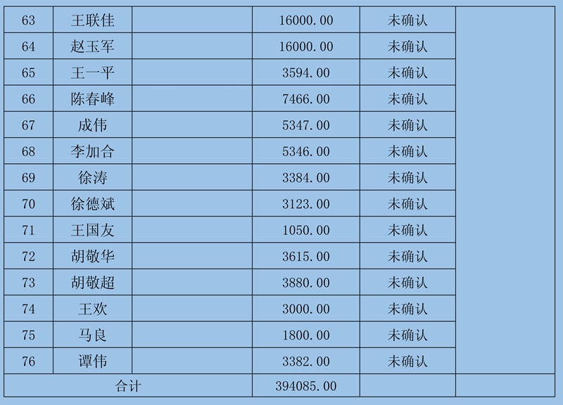 4、復(fù)核意見:按照法院判決或調(diào)解認(rèn)定優(yōu)先、一線工人優(yōu)先、原始登記優(yōu)先的原則,先行確認(rèn)119條金額11157052.9元;暫不予確認(rèn)99條金額9439341元,需進(jìn)一步調(diào)查復(fù)核;不予確認(rèn)2條(何江、唐治富施工隊(duì)非工資4815836.12元,胡家秀土地租金36000元)。
