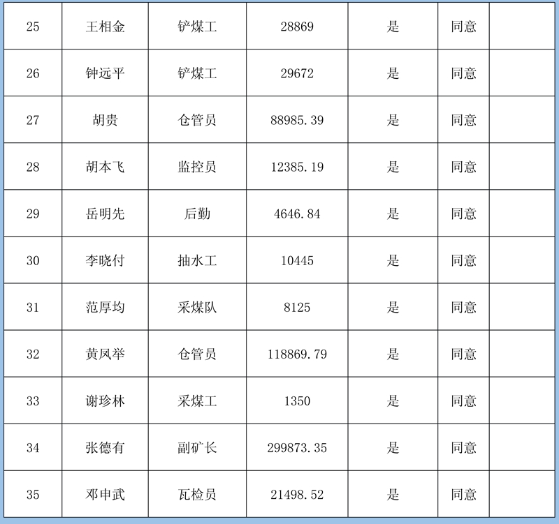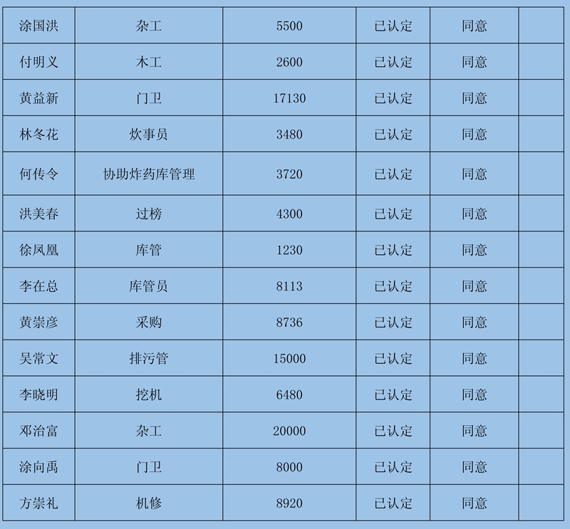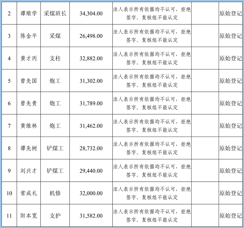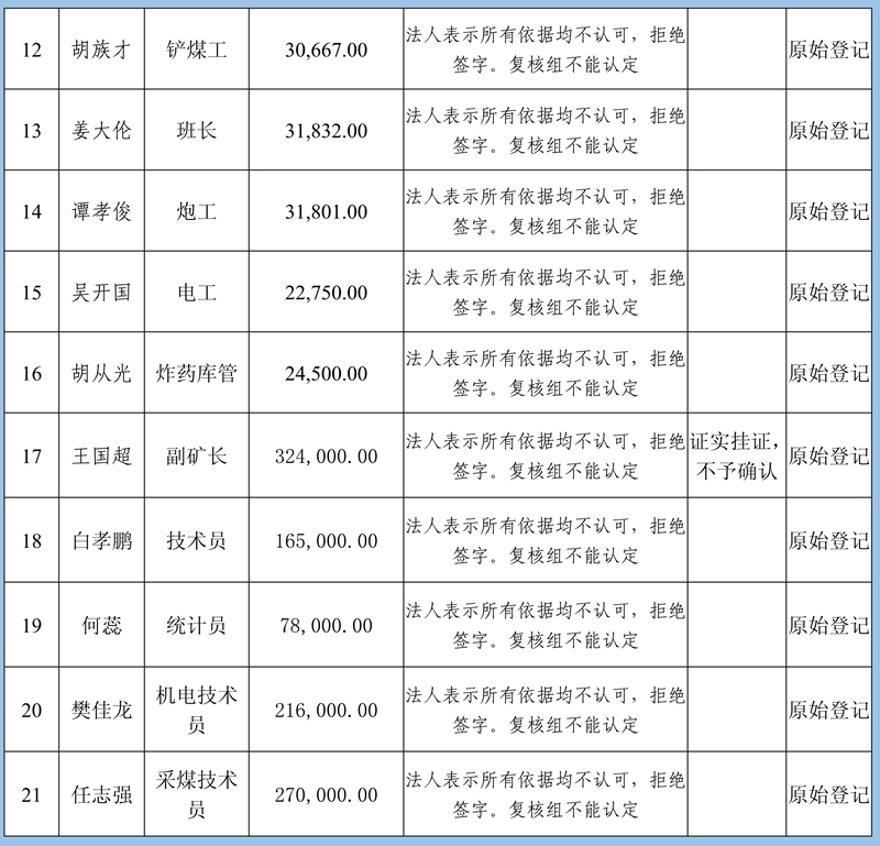 4、復(fù)核意見:建議予以確認(rèn)申報(bào)8條金額413830元;需調(diào)查核實(shí)再行確認(rèn)3條牟全書、牟全松和白啟波三人的申報(bào),當(dāng)事人未提供切實(shí)欠薪依據(jù),礦方亦不認(rèn)可;不予確認(rèn)1條劉永泉申報(bào)的欠薪經(jīng)核實(shí)為煤礦轉(zhuǎn)讓金。