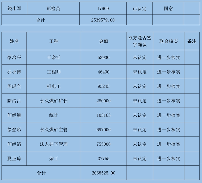 三、永久煤礦欠薪復(fù)核確認(rèn)情況
