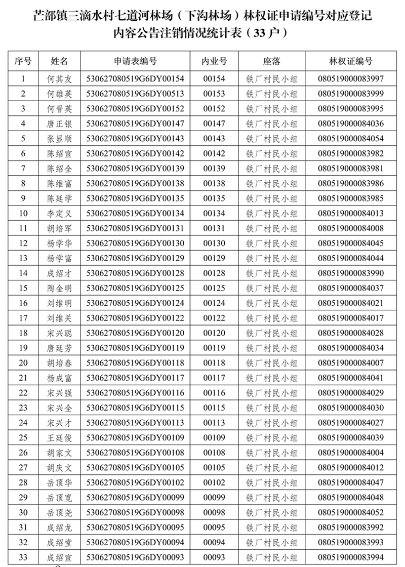 附件:1、芒部鎮(zhèn)三滴水村七道河林場(chǎng)(下溝林場(chǎng))林權(quán)證申請(qǐng)編號(hào)對(duì)應(yīng)登記內(nèi)容公告注銷情況統(tǒng)計(jì)表(33戶);