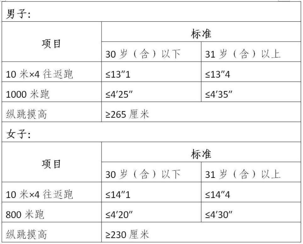 其標準按照招錄人民警察標準(人社部發(fā)〔2011〕48號)執(zhí)行,達不到以下標準的視為體能測評不合格。體能測評標準為: