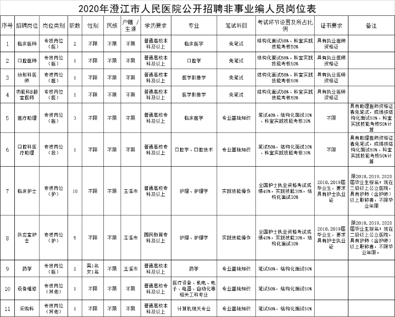 澄江市人民醫(yī)院2020年度面向社會公開招聘非事業(yè)編制工作人員38名,F(xiàn)將第一批招聘28名工作人員有關(guān)事宜公布如下: